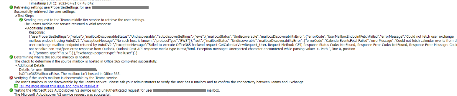 When the problematic user account was use to ran "Teams Calendar Tab" in Microsoft Remote Connectivity Analyzer, it failed with "Verify if the user's mailbox is discoverable by the Teams service." (as attached) .My account was fine.