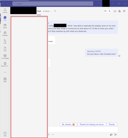 Has anyone else experienced this? Seems to be repeatable with both the desktop client and web version. When Teams is reduced to a very narrow width the chat user list fly-out panel overlaps with...