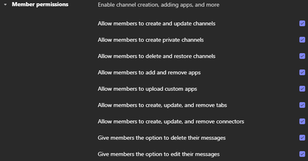 Hello, I have found that the default member permissions per team in my organization's environment is as shown below. I'm having trouble finding controls to change future channels from having the...