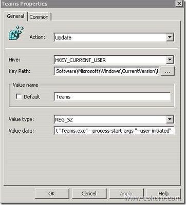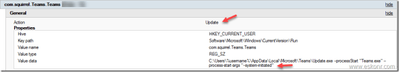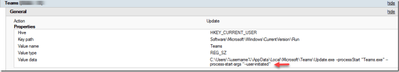 Value Data: C:\Users\%username%\AppData\Local\Microsoft\Teams\Update.exe --processStart "Teams.exe" --process-start-args "--user-initiated"