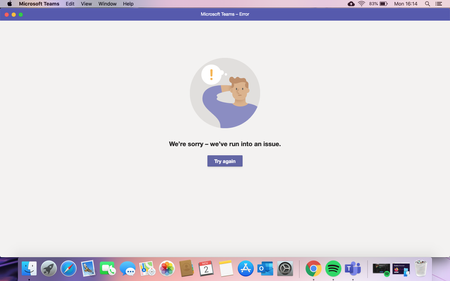 Hi bethornton Take a look at the solution offered in this post and see if it helps: https://answers.microsoft.com/en-us/msoffice/forum/msoffice_o365admin-mso_teams-mso_o365b/teams-error-were-sorry-weve-run-into-an-issue/438509b9-87cd-4a84-ad6e-21993bff6653