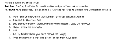 Please see below the summary I received.Now I'm able to upload the Viva Connections files again in the Teams Admin Center.