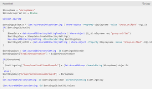 $GroupName = "RestrictM365Groups" $AllowGroupCreation = $False Connect-AzureAD $settingsObjectID = (Get-AzureADDirectorySetting | Where-object -Property Displayname -Value "Group.Unified" -EQ).id if(!$settingsObjectID) { $template = Get-AzureADDirectorySettingTemplate | Where-object {$_.displayname -eq "group.unified"} $settingsCopy = $template.CreateDirectorySetting() New-AzureADDirectorySetting -DirectorySetting $settingsCopy $settingsObjectID = (Get-AzureADDirectorySetting | Where-object -Property Displayname -Value "Group.Unified" -EQ).id } $settingsCopy = Get-AzureADDirectorySetting -Id $settingsObjectID $settingsCopy["EnableGroupCreation"] = $AllowGroupCreation if($GroupName) { $settingsCopy["GroupCreationAllowedGroupId"] = (Get-AzureADGroup -SearchString $GroupName).objectid } else { $settingsCopy["GroupCreationAllowedGroupId"] = $GroupName } Set-AzureADDirectorySetting -Id $settingsObjectID -DirectorySetting $settingsCopy (Get-AzureADDirectorySetting -Id $settingsObjectID).Values $Values = Get-AzureADDirectorySetting | ?{$_.DisplayName -eq "Group.Unified"} $GroupId = $Values.Values |?{$_.Name -eq "GroupCreationAllowedGroupId" } | Select -ExpandProperty Value Write-Host ("The name of the group defined by policy to control group creation is {0} and its object identifier is {1}" -f (Get-AzureADGroup -ObjectId $GroupId).DisplayName, $GroupId) Get-AzureADGroupMember -ObjectId $GroupId