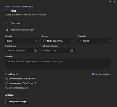Nachstehendes Beispiel zur Erläuterung. Ich bin verantwortlich für die Aufgabe TEST. Ich habe mir Gedanken gemacht, welche Unteraufgaben (Checkliste) es bedarf, um die Gesamtaufgabe TEST zu lösen. Dazu müssen 2 Personen (X und Y) etwas erledigen. Ich möchte die Unteraufgaben den Personen direkt zuweisen, so dass sie sich darum kümmern können und die Unteraufgabe als erledigt markieren, sobald sie damit fertig sind. In Asana hat das zuvor von der Denkweise so funktioniert. Hier funktioniert das so leider nicht. Wäre über eine Hilfestellung diesbezüglich sehr dankbar.