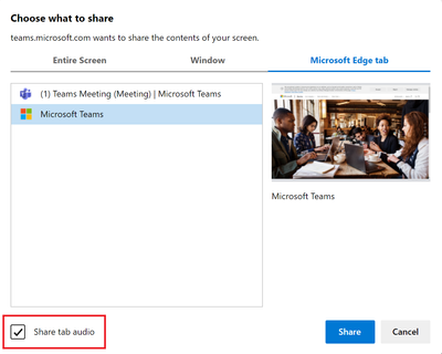 Users who share screen in Teams calls and meetings on web (in Microsoft Edge and Google Chrome) now have the option to share computer audio along with sharing screen.