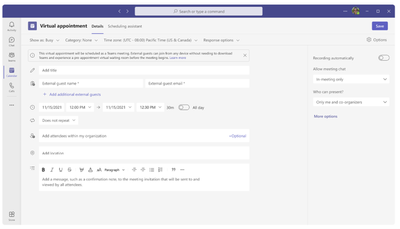 When meeting with someone from outside of your organization, the Virtual Appointment meeting can be used to ensure the person you are meeting with has a seamless experience with the meeting from start to finish - all without having to learn new tools or leave the standard scheduling flow. Those external guests you invite will receive a customized meeting invitation that includes appointment details and a quick-join button, which allows users to join the meeting from anywhere - without downloading Teams - and enter a pre-appointment waiting room before the meeting begins.