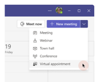 In the Teams app, navigate to the Calendar and click the dropdown menu next to the 'New Meeting' button in the top right corner. Select 'Virtual appointment' from the list.