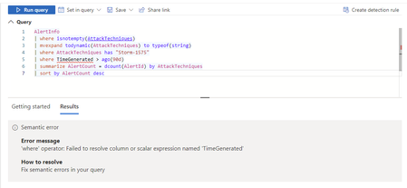 AlertInfo | where isnotempty(AttackTechniques) | mvexpand todynamic(AttackTechniques) to typeof(string) | where AttackTechniques has "Storm-1575" | where Timestamp > ago(90d) | summarize AlertCount = dcount(AlertId) by AttackTechniques | sort by AlertCount descIf I have answered your question, please mark your post as Solved