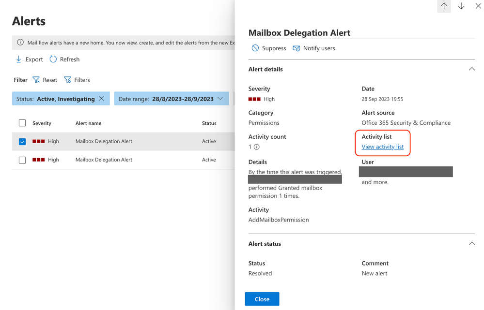 Alert policy - Add mailbox permission - No detailed alert.