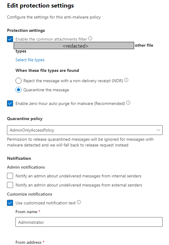 I have an antimalware policy set up which uses the common attachment filter. The issue I am having that if this policy is set, no further analysis appears to be done. An NDR will be generated with the original email as an attachment. Going outbound, the email attachment gets scanned and detected as malware, and our postmaster outbound message gets quarantined. What can be done to fix this. Obviously, it is correct that if people are sending malware to us, we should not be sending right back as an attachment. to an NDR.