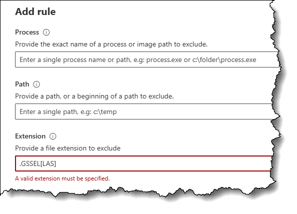 We have found a few other applications that had issues, including one that uses many different file extensions. Some of those files use square brackets in the extension name. This are valid files. However when I try to add them to our EDR Exclusions, I get an error "a valid extension must be specified"... which is frustrating because it is a valid extension.