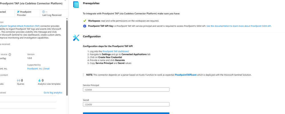 Deployment: The TAP connector also uses the codeless framework. You supply a TAP API service principal and secret (proofpoint SIEM API credentials) in the Sentinel content connector. The function app calls TAP’s /v2/siem/clicks/blocked, /permitted, /messages/blocked, and /delivered endpoints. The Proofpoint SIEM API limits queries to 1-hour windows and 7-day history, with no paging (all events in the interval are returned). (A Logic App approach could also be used, as shown in the Tech Community blog: one HTTP GET per event type and a JSON Parse before sending to Log Analytics.)