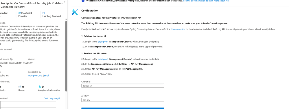 Deployment: Proofpoint POD uses Sentinel’s codeless connector (an Azure Function behind the scenes). You must provide Proofpoint API credentials (Cluster ID and API token) in the connector UI. The connector periodically calls the Proofpoint SIEM API to fetch new log events (typically in 1–2 hour batches). The data lands in the above tables. (Older custom logic-app approaches similarly parse JSON output from the /v2/siem/messages endpoints.)