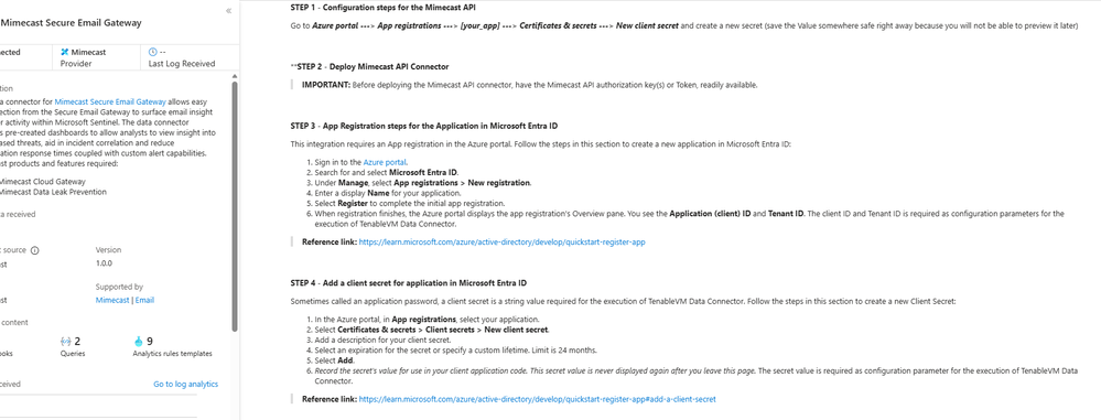 Deployment: Like Proofpoint, Mimecast’s connector uses Azure Functions via the Sentinel content hub. You install the Mimecast solution, open the connector page, then enter Azure app credentials and Mimecast API keys (API Application ID/Key and Access/Secret for the service account). As shown in the deployment guide, you must provide the Azure Subscription, Resource Group, Log Analytics Workspace and the Azure Client (App) ID, Tenant ID and Object ID of the admin performing the setup. On the Mimecast side, you supply the API Base URL (regional), App ID/Secret and user Access/Secret. The connector creates a Function App that polls Mimecast’s SIEM APIs on a cron schedule (default every 30 minutes). You can optionally specify a start date for backfilling up to 7 days of logs. The default tables are MimecastSIEM_CL (for email flow logs) and MimecastDLP_CL (for DLP/TTP events), though custom names can be set.