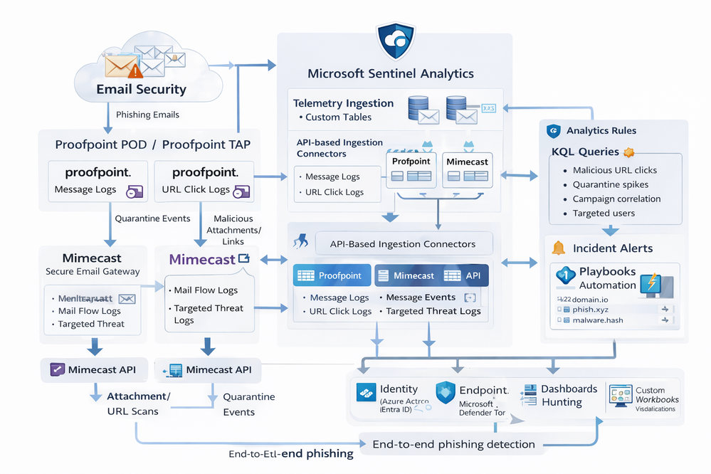 Microsoft Sentinel can ingest rich email security telemetry from Proofpoint and Mimecast to power advanced phishing detection. The Proofpoint On Demand (POD) Email Security and Proofpoint Targeted Attack Protection (TAP) connectors pull threat logs (quarantines, spam, phishing attempts) and user click data into Sentinel. Similarly, the Mimecast Secure Email Gateway connector ingests detailed mail flow and targeted-threat logs (attachment/URL scans, impersonation events). These integrations use Azure-hosted ingestion (via Logic Apps or Azure Functions) and the new Codeless Connector framework to call vendor APIs on a schedule. The result is a consolidated dataset in Sentinel’s Log Analytics, enabling correlated alerting and hunting across email, identity, and endpoint signals.