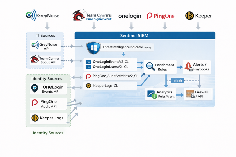 Microsoft Sentinel’s capability can be greatly enhanced by integrating third-party threat intelligence (TI) feeds (e.g. GreyNoise, Team Cymru) with identity and access logs (e.g. OneLogin, PingOne). This article provides a detailed dive into each connector, data types, and best practices for enrichment and false-positive reduction. We cover how GreyNoise (including PureSignal/Scout), Team Cymru, OneLogin IAM, PingOne, and Keeper integrate with Sentinel – including available connectors, ingested schemas, and configuration. We then outline technical patterns for building TI-based lookup pipelines, scoring, and suppression rules to filter benign noise (e.g. GreyNoise’s known scanners), and enrich alerts with context from identity logs. We map attack chains (credential stuffing, lateral movement, account takeover) to Sentinel data, and propose KQL analytics rules and playbooks with MITRE ATT&CK mappings (e.g. T1110: Brute Force, T1595: Active Scanning). The report also includes guidance on deployment (ARM/Bicep examples), performance considerations for high-volume TI ingestion, and comparison tables of connector features. A mermaid flowchart illustrates the data flow from TI and identity sources into Sentinel analytics. All recommendations are drawn from official documentation and industry sources.