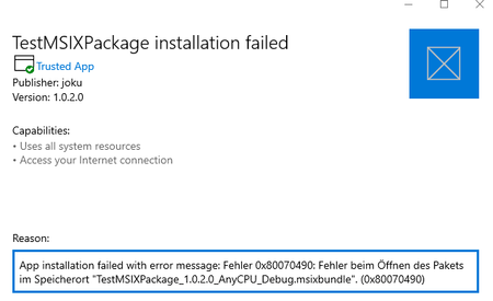 Hi, since I updated Windows 10 to version 19043.1202 (from 19043.1165), the installation via an appinstaller hosted via IIS on a remote server (by copying files to the wwwroot folder) fails with ...