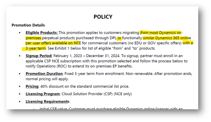It would be weird if Microsoft would allow customers to discontinue their BREP, allow them to purchase just 20 seats D365 licenses, execute to project, and after the project (maybe costing years of development time) they can still purchase the promo.