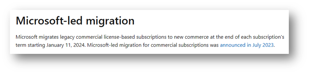 The following documentation says that Microsoft will migrate legacy commercial license-based subscriptions to new commerce at the end of each subscription's term: