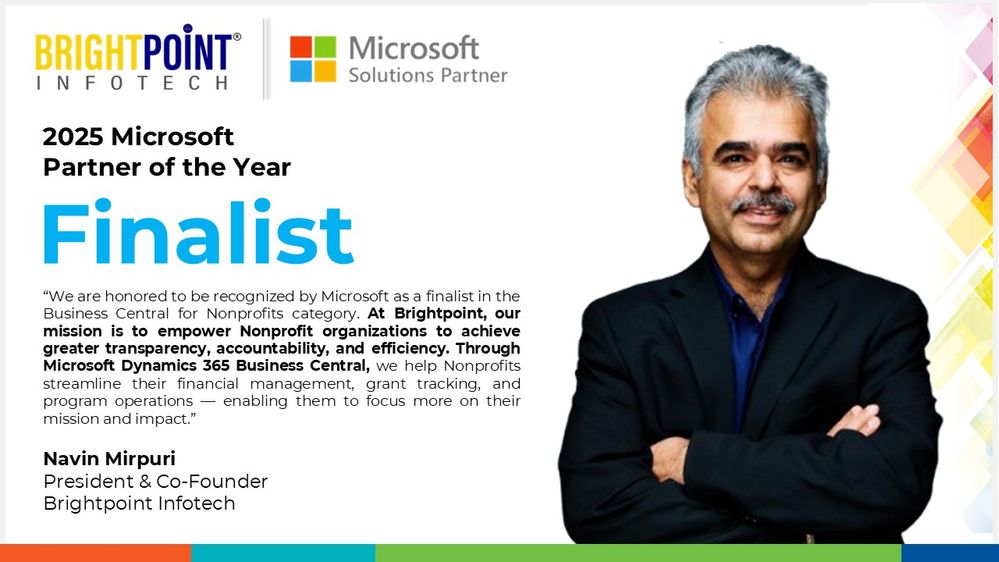 Brightpoint Infotech is honored to be recognized by Microsoft as a finalist in the Business Central for Nonprofits category. At Brightpoint, our mission is to empower nonprofit organizations to achieve greater transparency, accountability, and efficiency through technology.