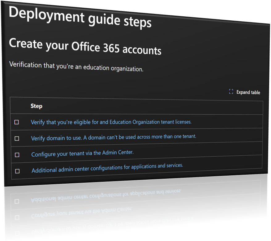 Applications like Microsoft Teams, SharePoint, OneDrive, Exchange Online are the core to a Microsoft tenant. Getting these applications setup are essential to allowing users in education to access services and apps like Learning Accelerators.
