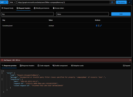 I am trying to filter users by the 'companyName' field and always receive a '400 Bad Request' error. As suggested in many similar issues, I added '$count=true' and the 'ConsistencyLevel=eventual' hea...