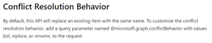 Hi, Does anyone know how to make a request for uploading a small file (<250MB) with a cusotmized conflict behavior? In the https://learn.microsoft.com/en-us/onedrive/developer/rest-api/api/driveite...