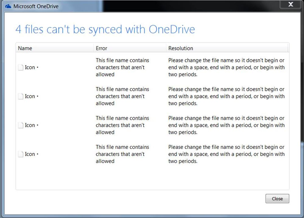 - Alexander Forst-RakoczyBrass ContributorDid you also show the "hidden system files"? In the "Folder Options" dialog box in the tab "View" uncheck "Hide protected operating system files". Where some of the files in this library created on a Macintosh? The file "Icon" is created on OS X whenever a file has a custom icon. The file name is "Icon^M" actually with "^M" being the visual representation of a carriage return. You can try to identify the files on a Mac, look for custom icons, and delete them or move the files away temporarily. You can also try to find those files via the web interface. But in my opinion it should be the responsibility of the cloud sync tool (OneDrive, OneDrive for Business, DropBox, etc.) to handle EVERY file appropriately according to the rules of the supported operating systems (or at least give meaningful error Messages).