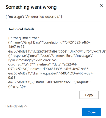 {"error":{"innerError":{},"name":"GraphError","correlationId":"84851393-a4b5-4d97-9a35-ea760fe6d9a3","isExpected":false,"code":"UnknownError","extraData":{},"response":{"error":{"code":"UnknownError","message":"{\r\n \"message\": \"An error has occurred.\"\r\n}","innerError":{"date":"2022-04-05T14:52:28","request-id":"84851393-a4b5-4d97-9a35-ea760fe6d9a3","client-request-id":"84851393-a4b5-4d97-9a35-ea760fe6d9a3"}}},"status":500,"serverStack":"","request":{},"error":{}}}