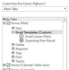 I have recently added a new tab (called Email Templates) to my Outlook ribbon ... I currently have two template emails (called 'Email Lesson Plans' and 'Expecting Poor Result') added to that n...