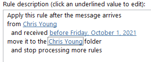 I am looking for help on a rule I am setting up (see pic below). The rule is not applying to any of Chris's reply emails. This is true whether Chris was the original email in the chain or not.