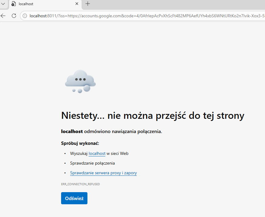 It works on one computer with a still-active Gmail account in Outlook, but not when a Gmail account is removed (on the second computer). I have deleted the OAuth lines from the registry on both machines, but I still get this error when trying to add a Gmail account. I think the reason might be connected with access to localhost (connection to localhost:8011 was reset):