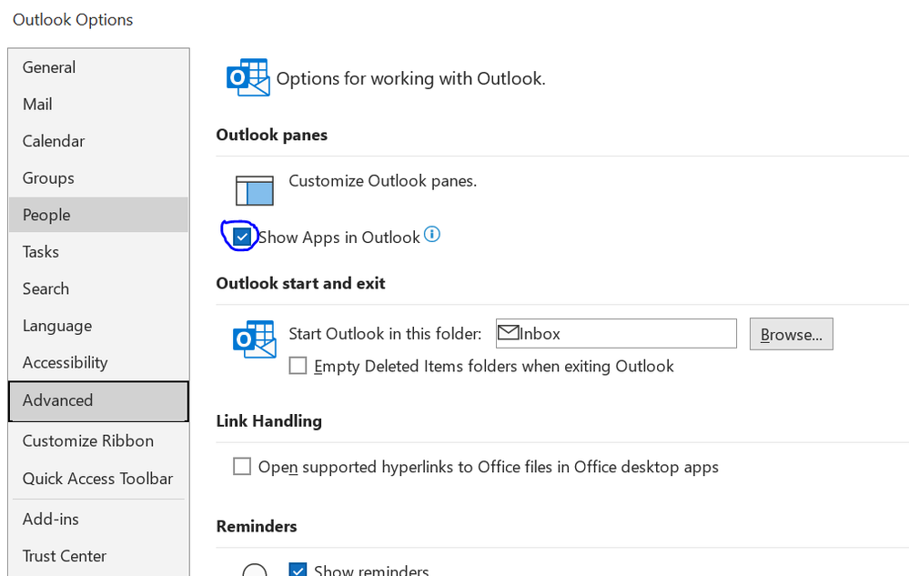 4. Under the Outlook Panes section, uncheck the box that says "Show apps in Outlook."