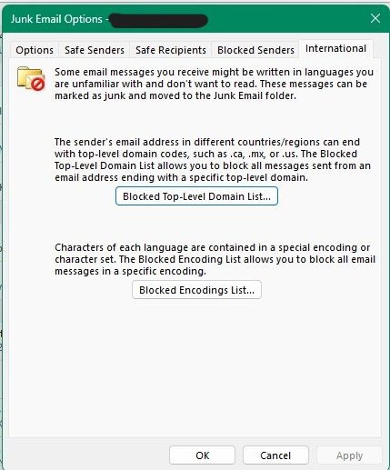 That option seems to be removed from OWA and New Outlook. For 365 business, you can add a mailflow rule in the Exchange admin center, that should have international blocking for the entire domain, or in the Protection/spam settings. Here is a post that should guide you from the Tech Community.