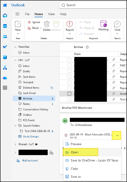 - hatemicosoftCopper ContributorI have the same issue. In prior Outlook it was 1 click to get a PDF open in my default PDF software. Now its 10-15 clicks and opening files I have to download to a specific location.