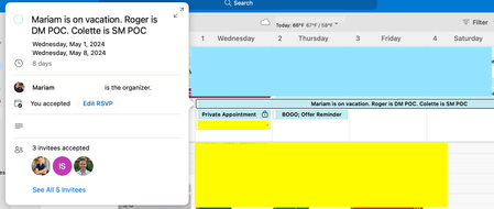 I have calendar invites that span multiple weeks that are not displaying across multiple calendar weeks. For instance, a team member is having a vacation from Wednesday, May 1, 2024 to Wednesday, May...