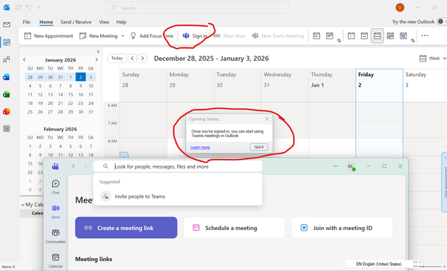Outlook calendar cannot view Teams. It always asks for 'Sign in'. If I click it, it opens up Microsoft Teams windows. Both app are using the same account. I have already re-installed Teams; add-in on outlook is also done. I am using 365 personal account. What else I can do?