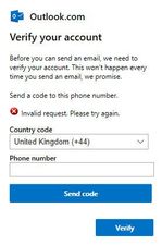 I have now been unexpectedly asked to verify my Outlook account by sending a code to my United Kingdom (+44) phone number. I have not declared a prearranged phone number. Entering my land line phone number is rejected with the appearance of Invalid request. Please try again.
