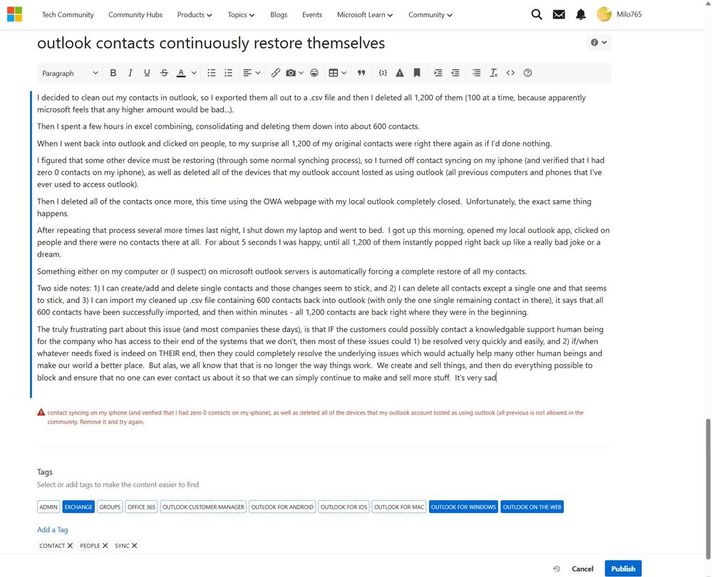 After repeating that process several more times last night, I shut down my laptop and went to bed. I got up this morning, opened my local outlook app, clicked on people and there were no contacts there at all. For about 5 seconds I was happy, until all 1,200 of them instantly popped right back up like a really bad joke or a dream.