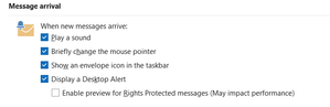 I've been having this issue for the past few months (had been using Outlook in browser in the interim) and have only gotten around to addressing it now. I went to Options > Message Arrival tab and ...