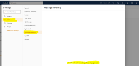 Hi, I am looking for Rules in OWA -> Settings Cog -> "View All Outlook Settings" -> Email but it is not there. Also, I have Message Handling but getting a message that it is unable to load. ...
