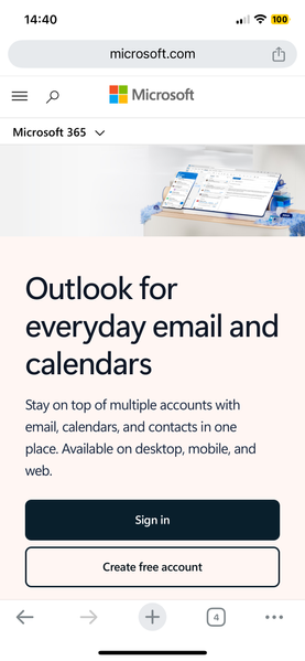 For the past few days I cannot log into my outlook account from my Iphone. Though I'm logged in, it keeps jumping back to the new landing page (see below). Even if I click on the "sign-in" or "create...