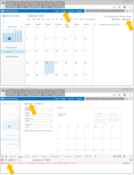 When selecting the "print"-option for calendar in OWA, nothing happens. Message in the console: Ignored call to 'print()'. The document is sandboxed, and the 'allow-modals' keyword is not set. I...