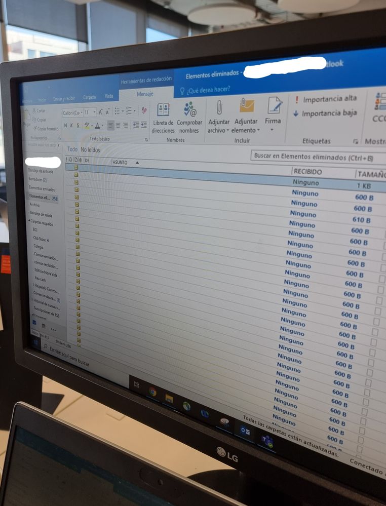 Todos los días, cuando se abre el aplicativo Microsoft Outlook y se le aplica el filtro de no leídos a la bandeja de entrada, esta muestra una lista de correos electrónicos sin cuerpo y con un peso de 600Bytes como lo muestro a continuación. (la imagen muestra los correos electrónicos eliminados por la usuaria, pero estos aparecen en la bandeja de entrada al aplicarle el filtro de no leídos como lo mencione)