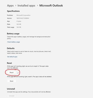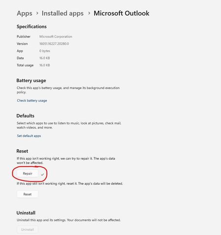 Start > Settings (gear icon) > Apps > Apps & features > Outlook > Advanced Options > Repair