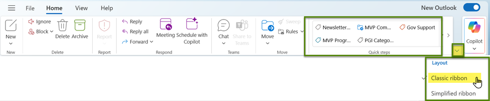 Your Quick Steps items will appear in the New Outlook ribbon. You must change the ribbon layout from Simplified to Classic.