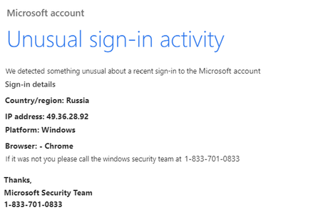 I received the following email a few minutes ago: From: MS-Support Centre <outlook_A2990F9CE77AA9F7@outlook.com> Sent: Tuesday, January 28, 2020 10:16 AM Subject: Account unusual sign-in activity ...