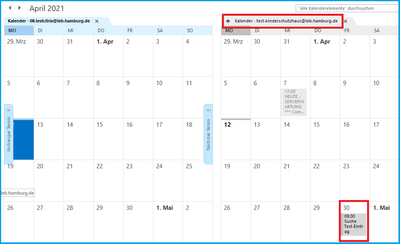 Der Kalendereintrag ist in einem zusätzlichen Postfach für den, 30.04.2021 "Suche Test-Eintrag" vorhanden.