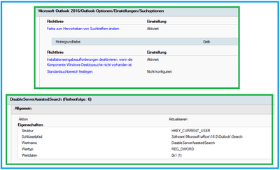 Es existiert eine GPO in der die ADMX Microsoft Outlook 2016 bearbeitet wurde. Zwei Einstellungen die für die Suche bearbeitet wurden sind diese.