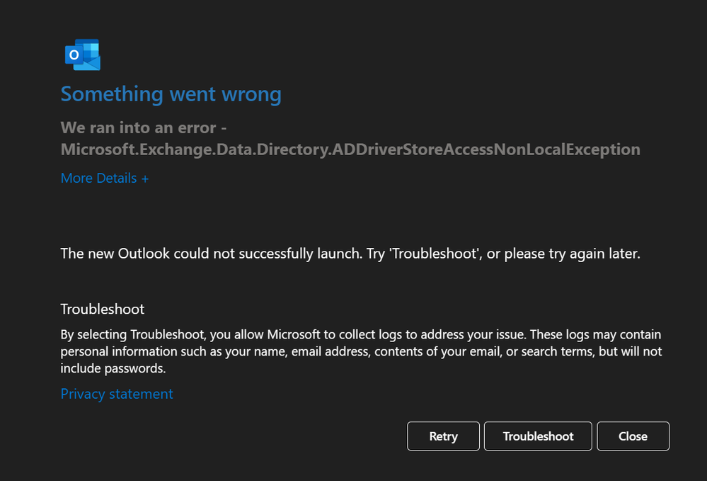 I have that same error in my research queue right now. I just did some online research and found some tips that might help. I have not tested these yet, the client chose to go back to Classic. Type in the error "something went wrong we ran into an error microsoft.exchange.data" and you will see a few options for repair. One looked like something I would try, "Clear Local Cache: Press Win + R, type olk.exe --clearLocalState, press Enter, then delete the contents of %LocalAppData%\Microsoft\Olk"